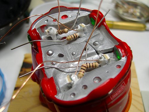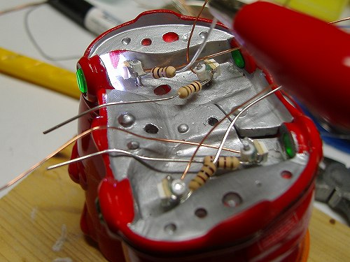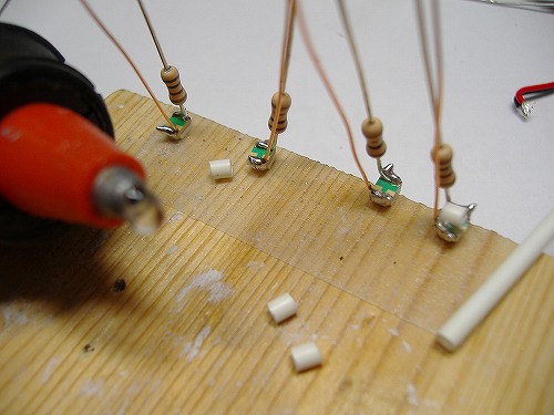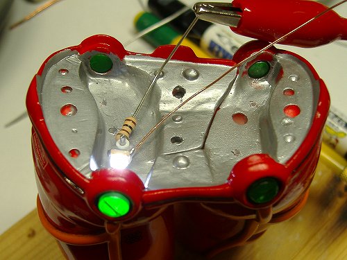 発光テストをします。その際抵抗やエナメル線を持って強引な扱い方をしないように気をつけてください。電極がはげて使い物にならなくなります。
