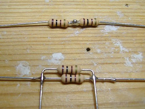 画像のように直列、並列の抵抗をハンダ付けして2個づつ作ってください。