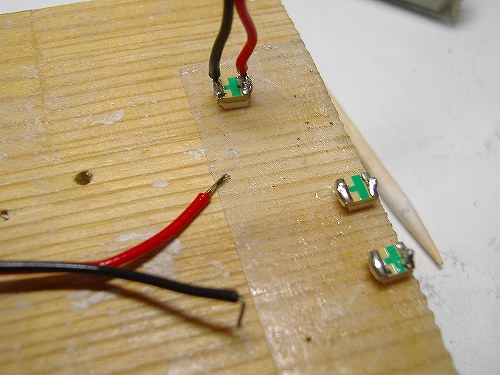 LEDは小さいので両面テープに固定してハンダ付けします。