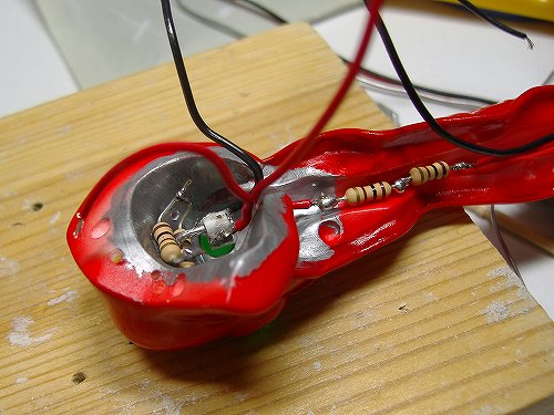 手首のLEDは、電線を抵抗のところで固定するぐらいでOKです。私はホットボンドで軽く固定しました。
