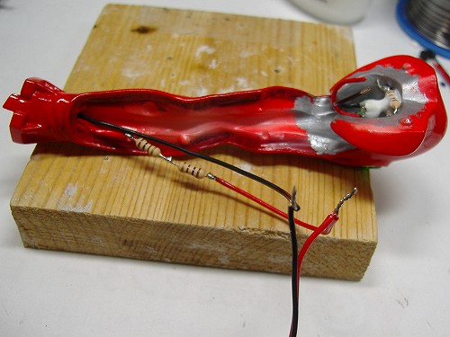 腕のひじあたりに直列の抵抗を設置するのでLEDのプラス線にハンダ付けして肩の方にプラス線を送ります。