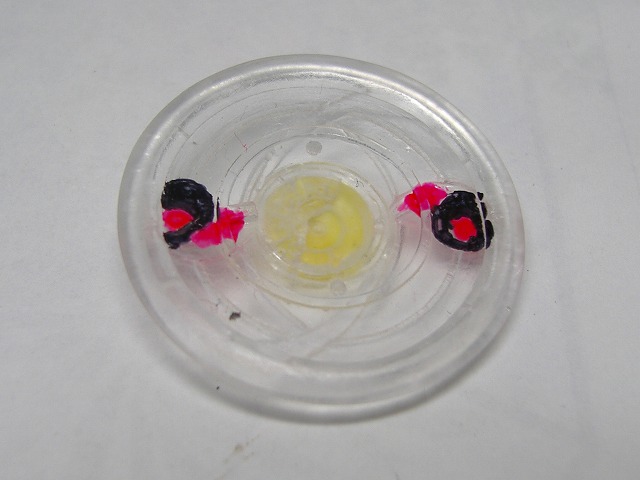 クリアーパーツで抜いているので裏から砂の部分を蛍光色でなんとなく塗って砂以外の空間部分を黒でなんとなく塗る。塗り分けはタイチーマークに。真ん中に向かう砂の筋みたいなのがあるのでそこも蛍光色で適当に塗る。全部裏から筆塗り。表のセンターの機械は光のエフェクトパーツを瞬着でつけるのでキャスト地のまま。瞬着をパーツの間に流し込むといい感じですける。
