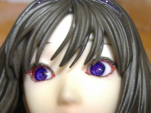 メタルプライマーを吹く。マスキングしてクリアーパープルを適当に調色して吹く。クリアーでコーティング。ガンダムマーカーのリアルタッチグレイ1でふちを丸く書いて真ん中に瞳孔を書き込む。瞳のシャドー(薄いクリアブルー)を眼球の上方に吹く。